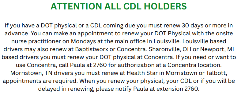 Starting immediately, all recertifications must be completed 30 days prior to the expiration date and you must submit the Medical Examiner Certificate to the state that you are licensed in immediately. To assist in this process, we will be notifying drivers three months in advance of their upcoming expirations. If you have underlying medical issues such as diabetes, hypertension, sleep apnea, or prior cardiovascular disease, then you must obtain the proper documentation and/or release to safely drive a CMV from that treating physician prior to your recertification appointment. If you have any questions or concerns, please feel free to contact the Safety Department.