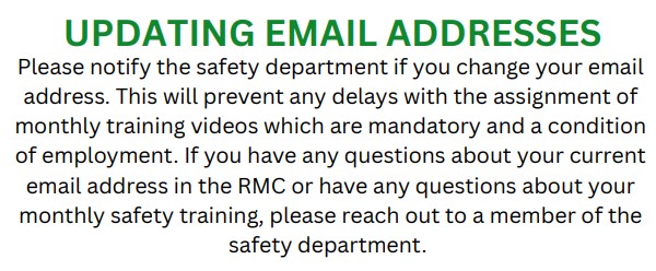 All employees are required to watch this video by the end of September. If you have trouble accessing the RMC, please contact someone in the Safety Department.